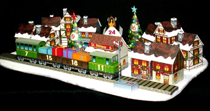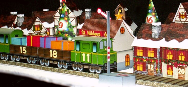 Mit dem Bastelbogen lässt sich ein toller Adventskalender selber basteln. In den Häuschen, der Eisenbahn, den Päckli und Christbäumen usw. lassen sich kleine Geschenkli verstecken.