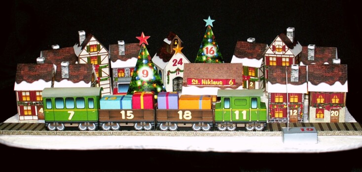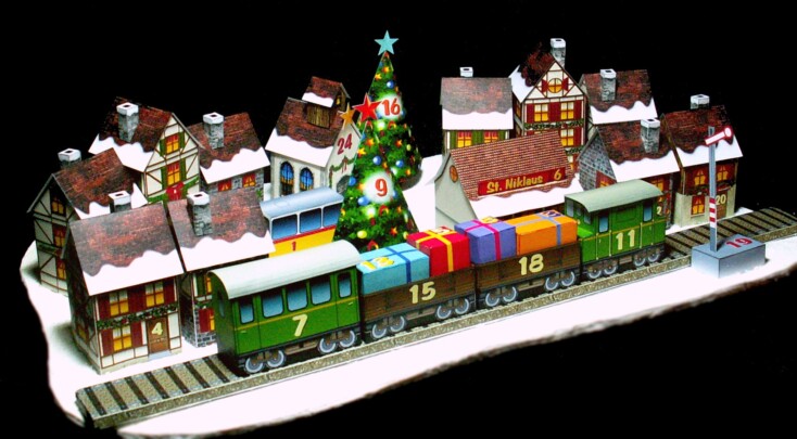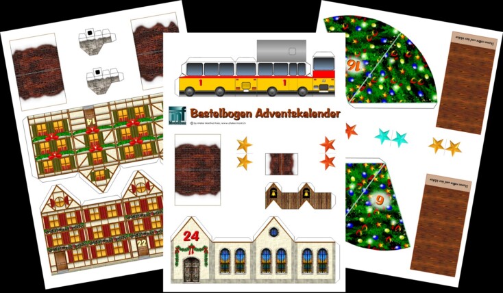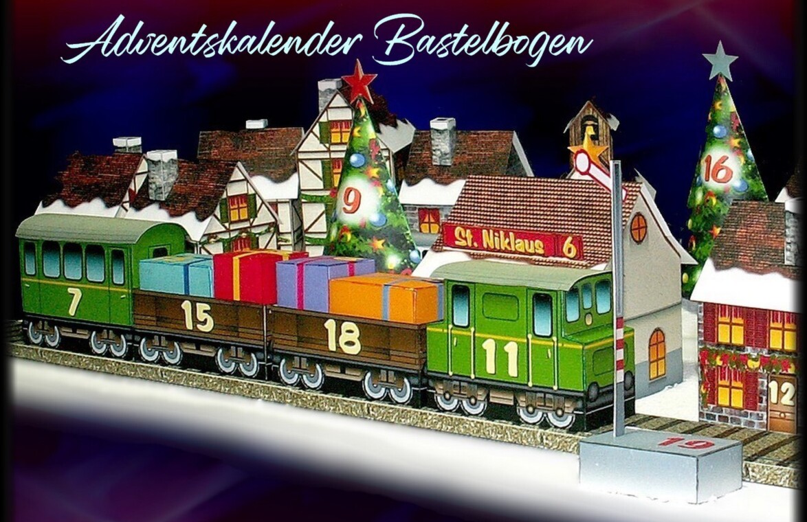 Mit dem Bastelbogen lässt sich ein toller Adventskalender selber basteln. In den Häuschen, der Eisenbahn, den Päckli und Christbäumen usw. lassen sich kleine Geschenkli verstecken.